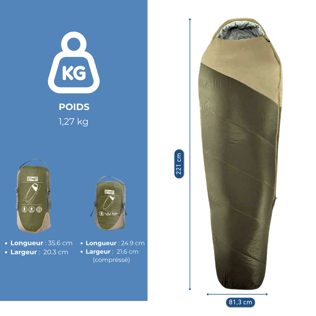 Avec un poids de 1,5 kg, il reste dans une catégorie standard pour un sac de couchage 3 saisons destiné aux adultes.