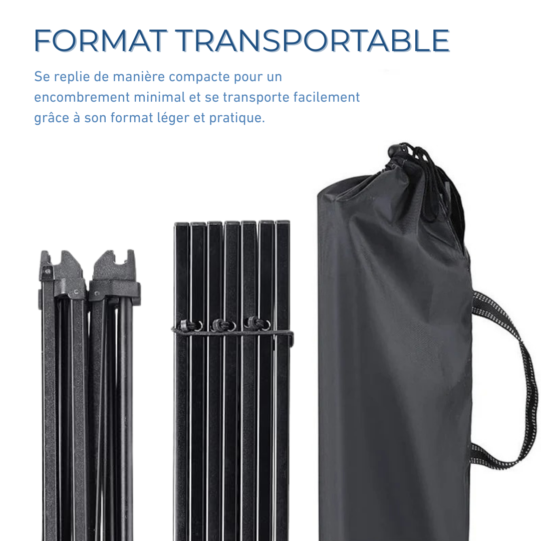 Son système pliable facilite le rangement après utilisation. Une fois repliée, elle se place dans son sac de transport inclus, ce qui simplifie le stockage et les déplacements. Indiquée comme légère et portable, elle répond au besoin d’un équipement pratique pour le camping, la randonnée ou le voyage, sans ajouter de contrainte inutile à votre organisation.