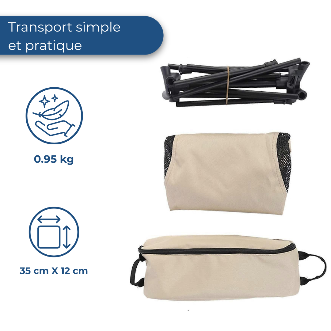 Grâce à son système de montage simple, la structure se déplie rapidement et la toile se fixe facilement grâce aux sangles d’installation prévues. Une fois repliée, la chaise se range dans un sac compact qui prend très peu de place dans un sac à dos ou un coffre de voiture. Son poids de seulement 0,95 kg permet de la transporter sans effort lors de toutes vos activités en extérieur.